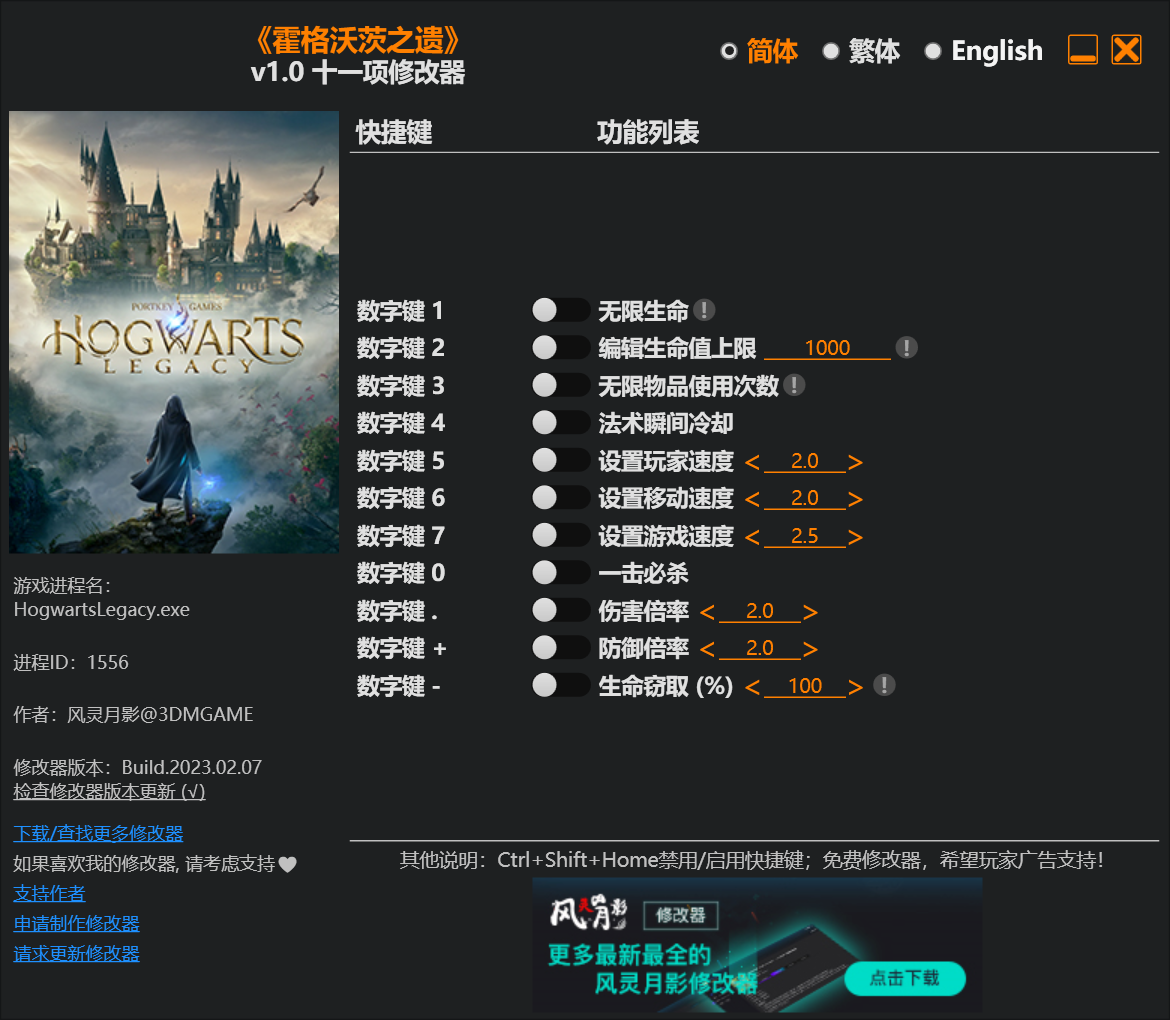 霍格沃茨之遗已经正式上线了,不少用户想要更加简便的游玩游戏,那就必须得来一个修改器了,这次多特游戏为大家带来的是霍格沃茨之遗风灵月影十一项修改器,快来下载看看吧。