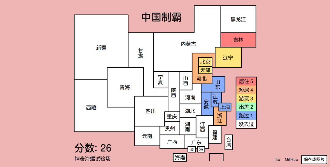 中国制霸生成器是一款区域制霸标记生成工具,玩家可以标记去过、看过、居住过的地区,可以标记6种标准,分别对应5到0分。标记的信息可以实时更新,再次打开还能看到之前的标记哦。