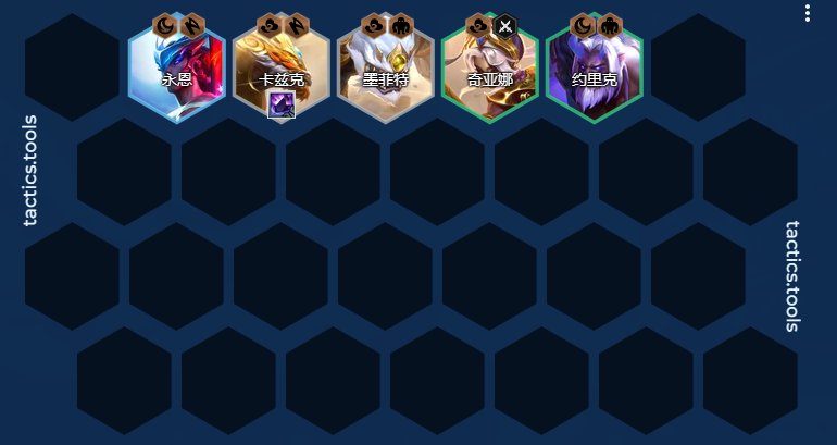 这里如果有剪纸转的话,可下佐伊和泰坦,补上塞拉斯和塔姆凑成四斗,给天使提供更好的输出环境。钢铁烈阳之匣给前排加双抗和护盾,也是一套挺不错的打法,适合后拉八钱和血量都不健康的情况。