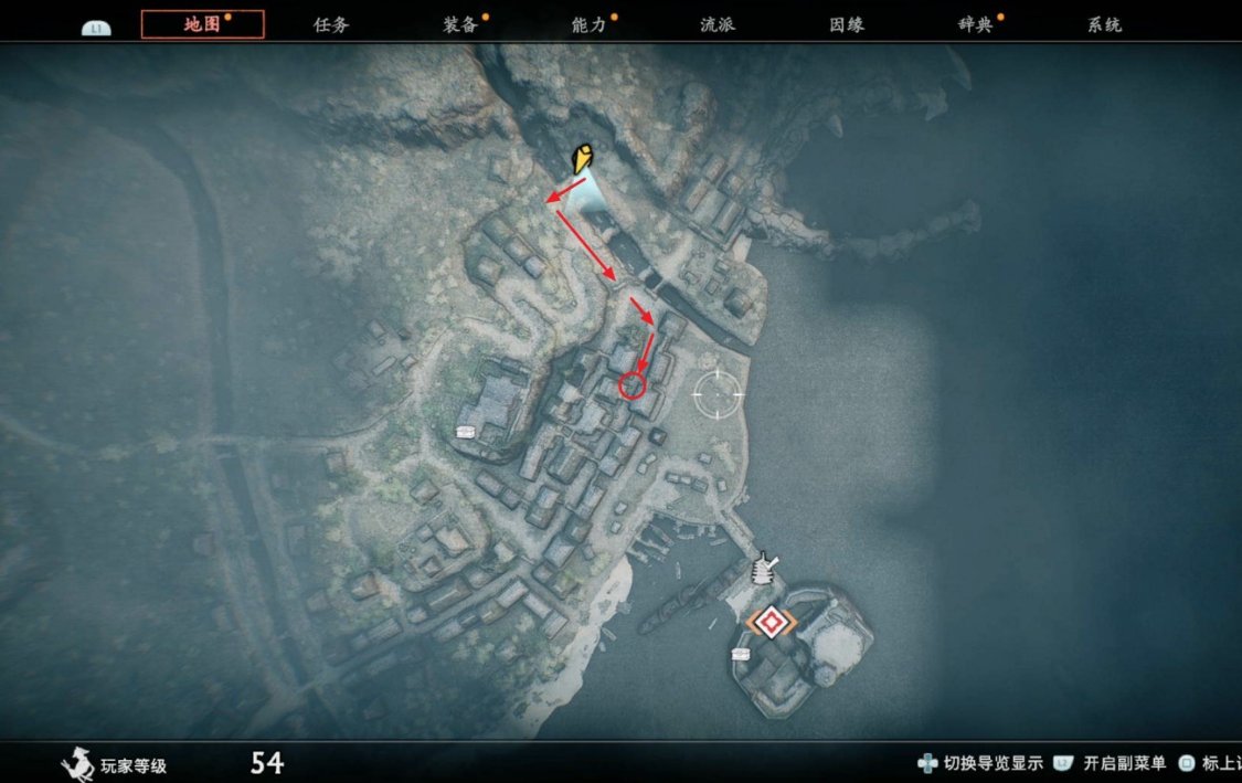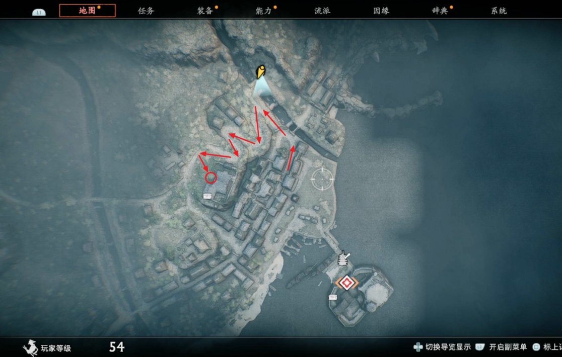 击败高手后按照下图所示的路线来到画圈的大房子前。