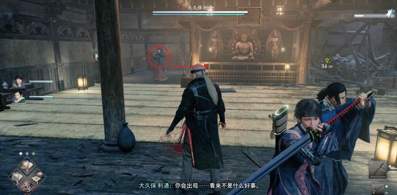 来到大厅发现大久保利通在此处,将其击败后从其身后的道路进入走廊。