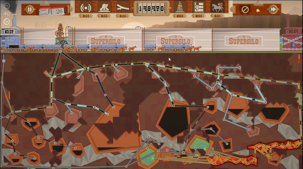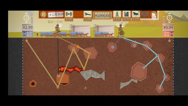 热力沸腾模式中我们可以和东西公司其中一个签订排他性条约——拿到一笔一次性的补助金,然后本局游戏中你只能将石油卖给该公司。游戏时间越早签订排他性条约你就能获得越多的补助金。这里需要提醒一下各位,排他性条约是除了贷款以外能够直接获取资金的方式,但签订排他性条约之前请大家确认好岩浆和天然气的位置,以便自己规划管道网络的构建、油罐的摆放,避免产生找到了岩浆找不到气,找到了气找不到岩浆或是两者都找到了但花了大价钱通天然气管道的惨剧发生。如果各位打算囤油养气的话,排他性条约是百利而无一害的,至少比贷款划算多了。