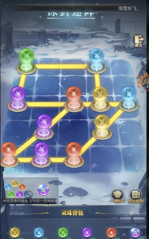 2、玩法规则:点击未放置灵珠的冰盘,可选择下方的灵珠进行放置,点击冰盘上的已装配的灵珠,可选择卸下操作,按灵珠的既定连通规则摆放灵珠,即可使冰盘之间的通路点亮,迷阵中的每条连线都处于点亮连通状态,即视为通关成功。