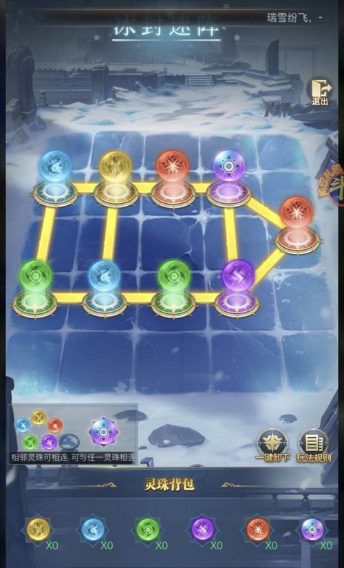 3、点击未放置灵珠的冰盘,可选择下方的灵珠进行放置,点击冰盘上的已装配的灵珠,可选择卸下操作,按灵珠的既定连通规则摆放灵珠,即可使冰盘之间的通路点亮,迷阵中的每条连线都处于点亮连通状态,即视为通关成功。