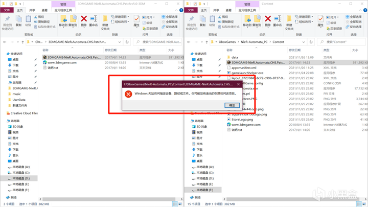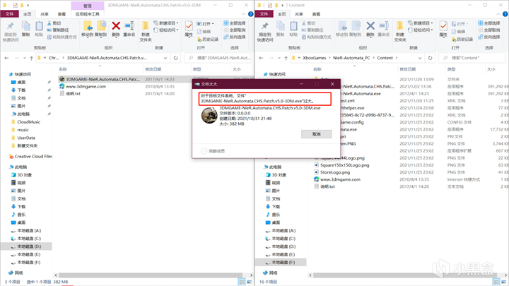 1、打开XboxGames文件夹找到NieR-Automata_PC,点进去后有一个Content文件夹,汉化包要在这个文件夹安装,此时直接将汉化包拖进会提示文件夹容量不足