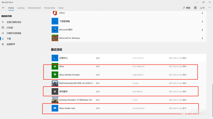 3.回到Microsoft Store 点击右上角更新,将Xbox; Xbox Insider hub;更新