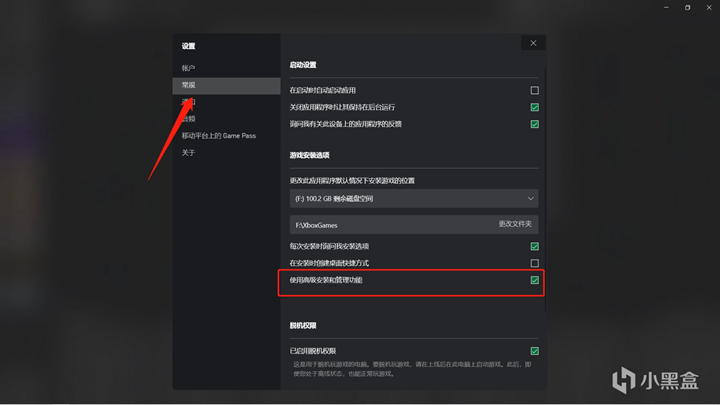 4.回到Xbox中,点击设置,常规,打开使用高级安装和管理功能