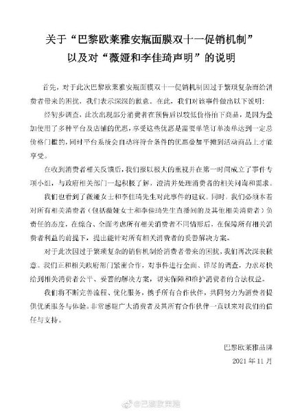 11月18日02:15,欧莱雅对“巴黎欧莱雅安瓶面膜双十一促销机制”以及“薇娅和李佳琦声明”作出官方回应。