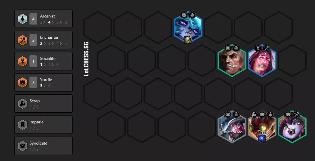 5人口核心羁绊是4黑魔法使3约德尔人,利用约德尔人前期的效果白嫖2星薇古丝,薇古丝只要到2星前期的过渡的关键,除了拉克丝的装备尽量去给薇古丝去做装备,肉装有什么做什么。