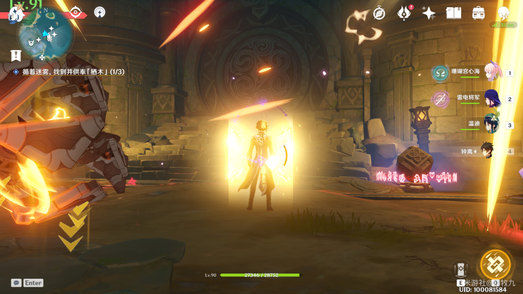 第三根羽毛在温迪的左边,注意这是第一根会跑的羽毛(但不是最后一根),大家要追着羽毛跑(),羽毛会穿过传送门,两个传送门之间有个雷神瞳,会自动触摸拿到,大家注意一下