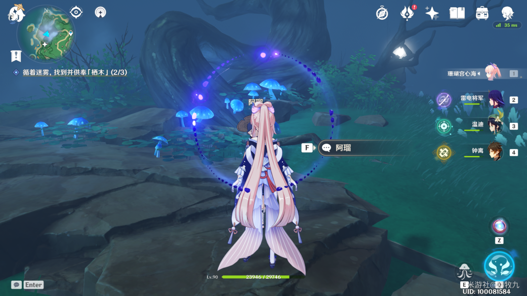 找到阿瑠对话,触摸栖木后你会看见三根羽毛都落下去了,下面都是水,这里需要触发三个仙灵的机关
