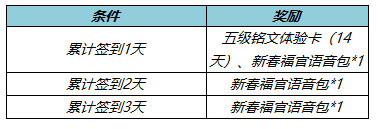 新春快乐!活动期间累计签到即可领取五级铭文体验卡(14天)、新春福官语音包等好礼!