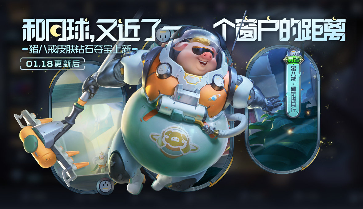 肚皮很大,因为里面装满了梦想!猪八戒新皮肤-潮玩探月行即将加入钻石夺宝,Q萌可爱的玩具宇航员,怀揣的登上月球的梦想,踏上冒险的旅程。不要放弃梦想,即使他是一只玩具猪猪,但他也决定去月球看看!