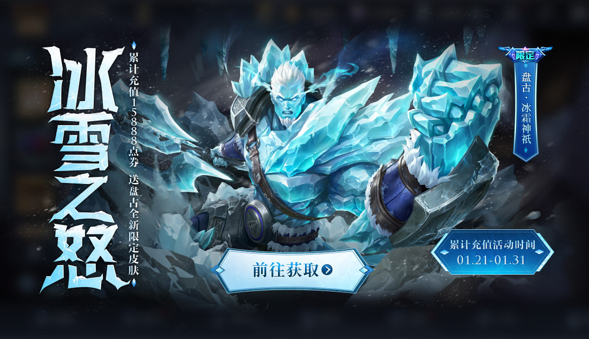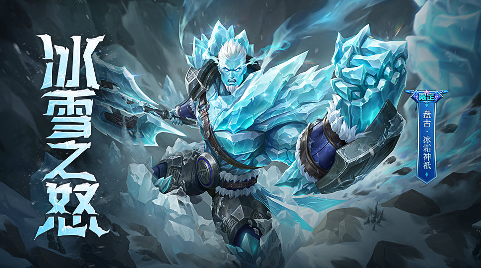 角色形象设计上,以大面积冰雪为基调,晶莹剔透的蓝色传递出极寒之意。冰雪身躯上覆盖重装盔甲,更显坚毅不屈。手中的巨斧也由冰霜铸成,刚硬锋利。