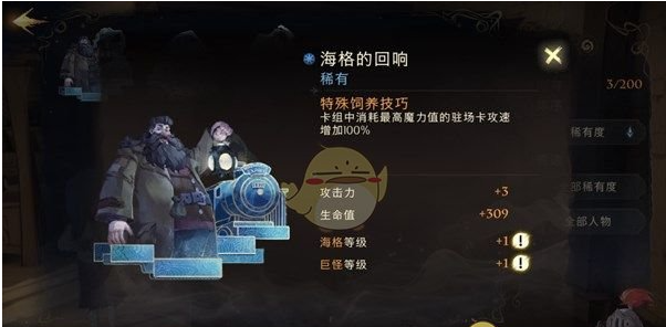 2、如果玩家将其作为卡组配置的回响,主角就还将取得攻击力+3以及生命值+309的加成。而同时,卡组中如果配置有“海格”或者“巨怪”,他们将在原本的等级上额外获得等级+1。