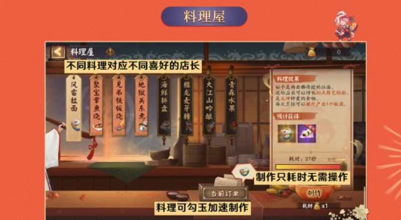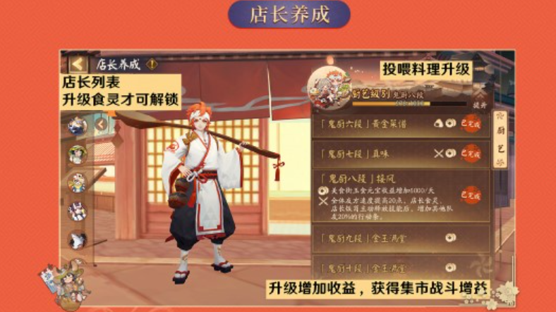 8种料理对应8个店长,投喂店长喜欢的料理可以升级加倍料理制作都会掉落「梦想饭团」,只可喂给妖怪食堂的店长食灵升级解锁全部料理和店长「梦想饭团」也可在「食之商人」处出售获得活动货币