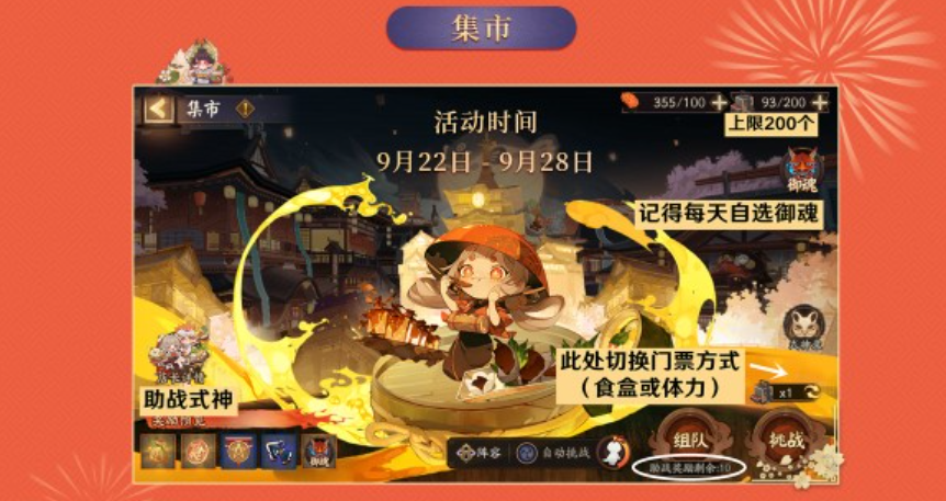 消耗「食盒」挑战集市可以享受「自选御魂」加成,每天0点刷新15种御魂自选4种可选择消耗6体力/次挑战集市,不掉落活动物品,但会掉落随机6星和绘卷碎片「集市挑战不限时,击杀即可,每次固定5000积分,且体力挑战每日上限999次」