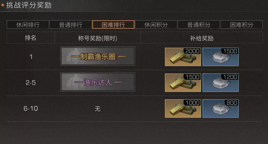 奖励分为排行奖励和积分奖励,困难排行前5名的幸存者还将会获得“制霸渔乐圈”和“渔乐达人”特殊称号奖励。