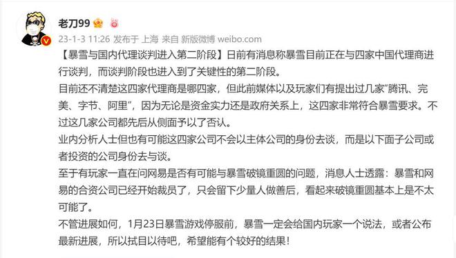 经常爆料魔兽消息的知名魔兽玩家@老刀99今天给出了暴雪与国内代理谈判的最新说法。
