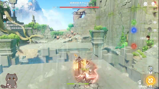 3、进入挑战中后,玩家可以通过普攻、重击打掉大日落果后形成残留果汁,勾引大丘丘人走到残留果汁上让它摔倒,使玩家造成百分比伤害的同时降低它的抗性;还可以通过普攻将卷心菜打向大丘丘人,两次后会把它击倒对它造成一定伤害并降低它的抗性;