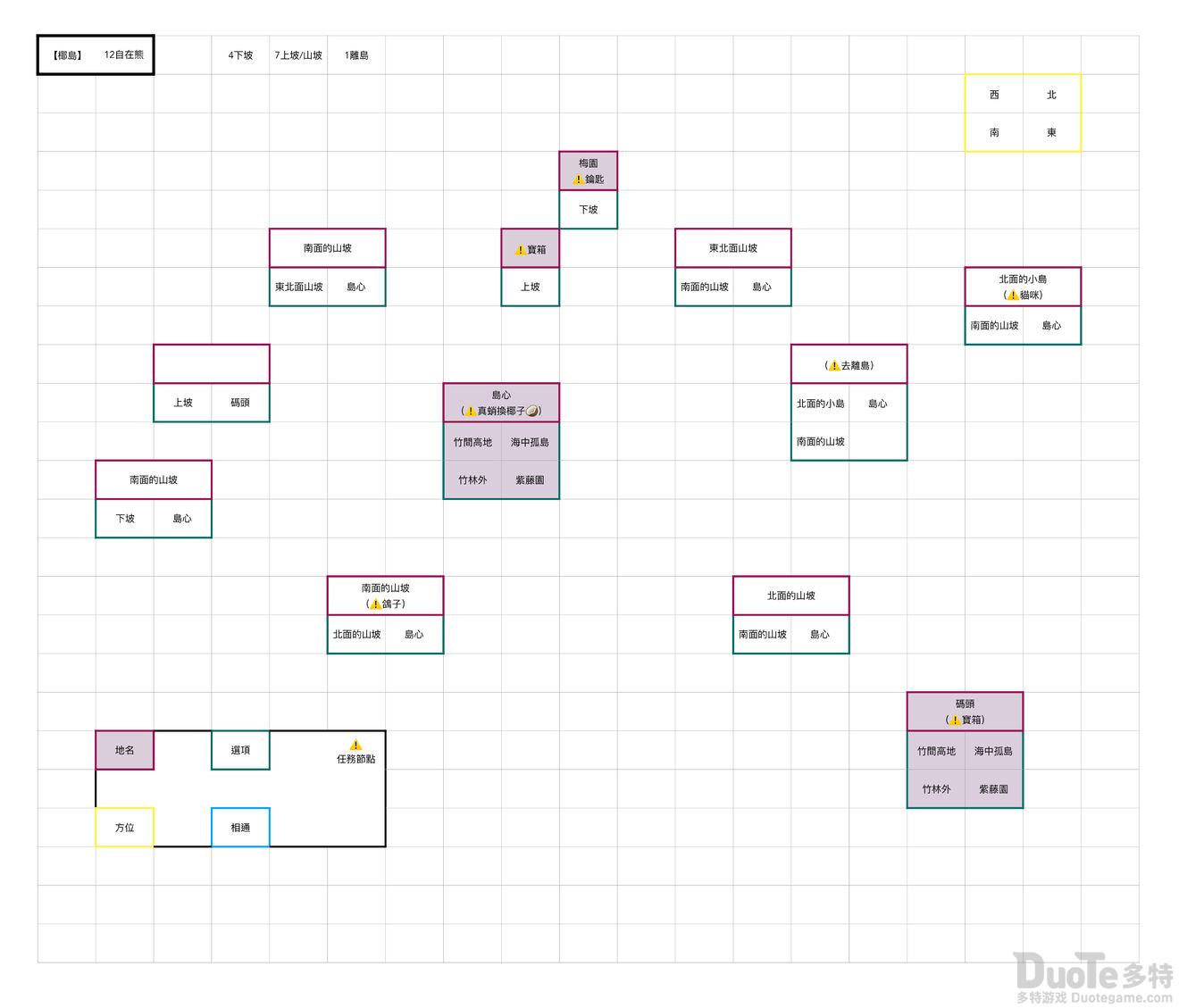带色彩的框有各自含义标注在表格左下角,色块是重要的地点,感叹号是一些我记得的剧情点要记得去。