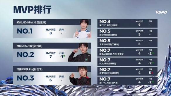 LGDNBW-小落(王科)以8次MVP位列榜首,