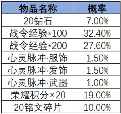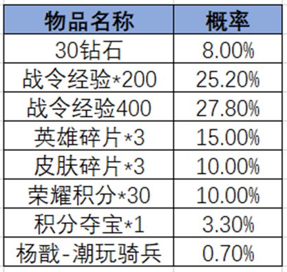 打开可随机获得以下奖励之一:杨戬-潮玩骑兵、积分夺宝抵用券*1、英雄碎片*3、皮肤碎片*3、荣耀积分*30、100/200战令经验、钻石*30。