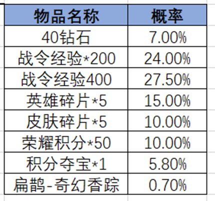 打开可随机获得以下奖励之一:扁鹊-奇幻香踪、积分夺宝抵用券*1、英雄碎片*5、皮肤碎片*5、荣耀积分*50、200/400战令经验、钻石*40。