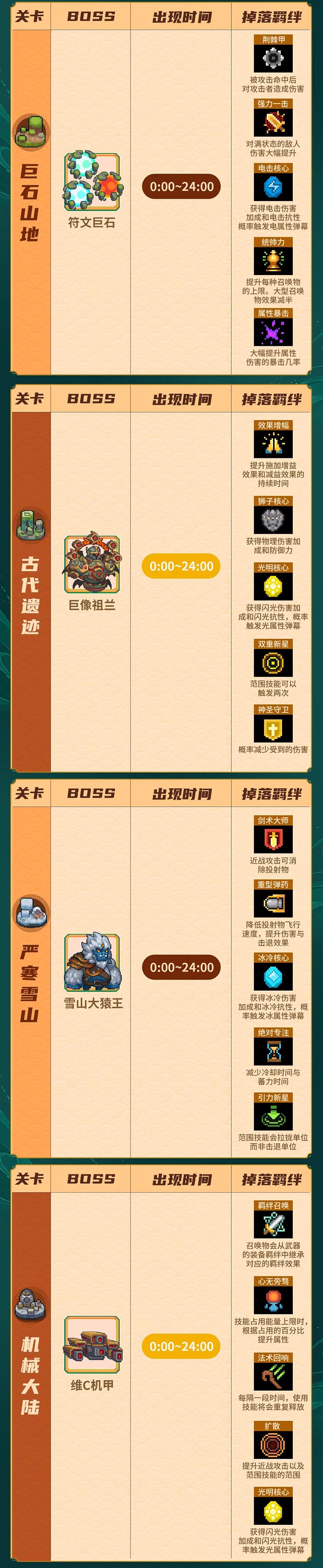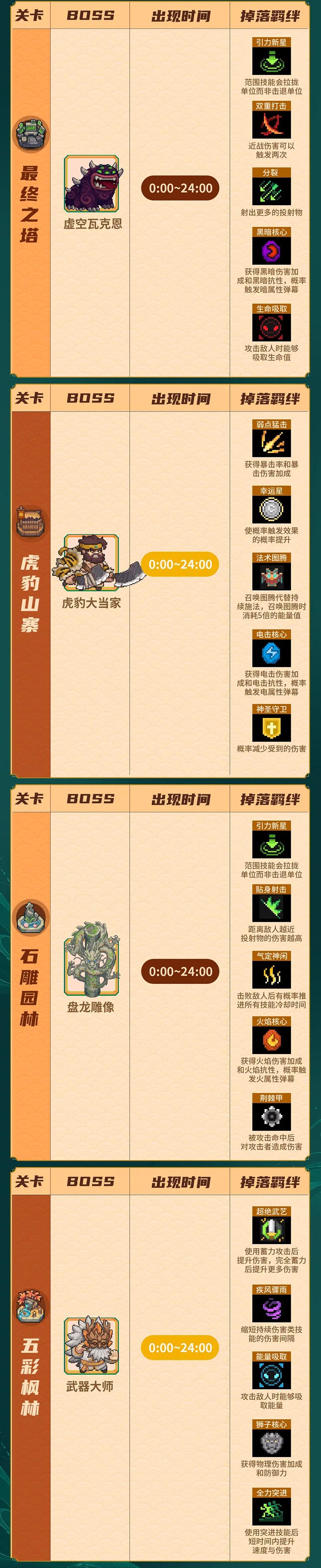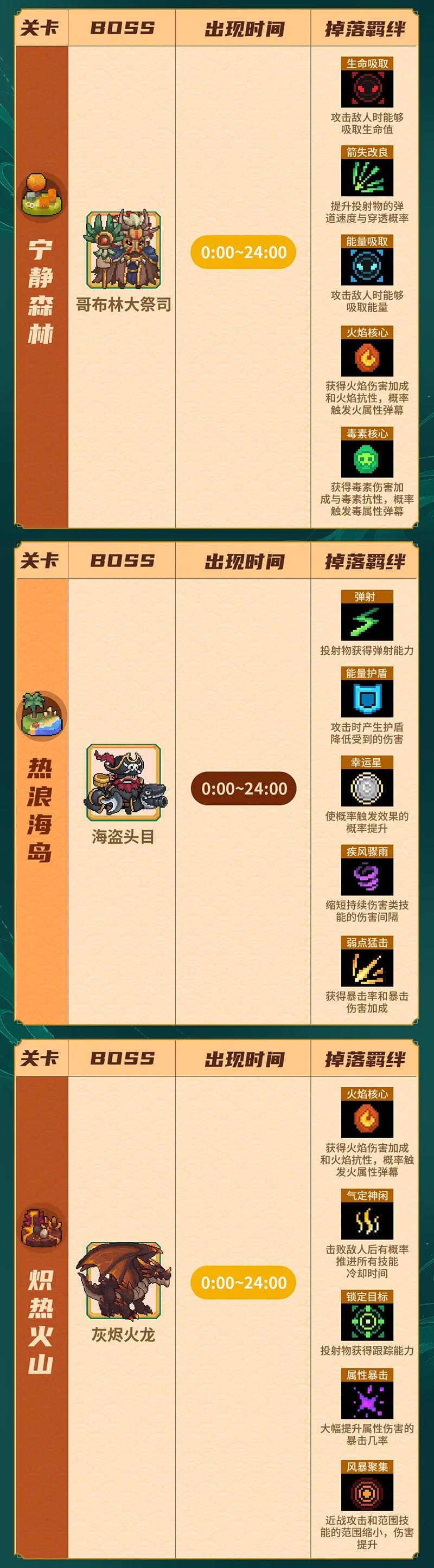 温馨提示:此表格一般在有新常驻boss出现时会进行更新,小骑士记得要来看看!