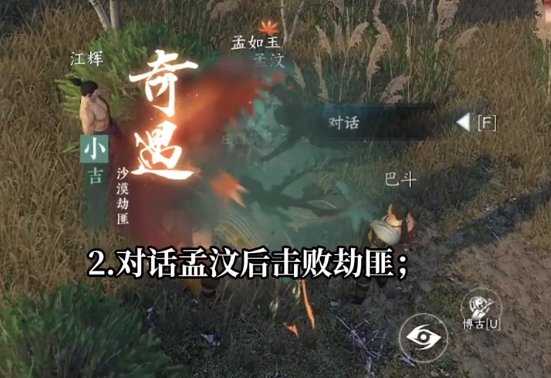 2、触发之后,与孟汶对话了解详情,然后击败3个沙漠劫匪。