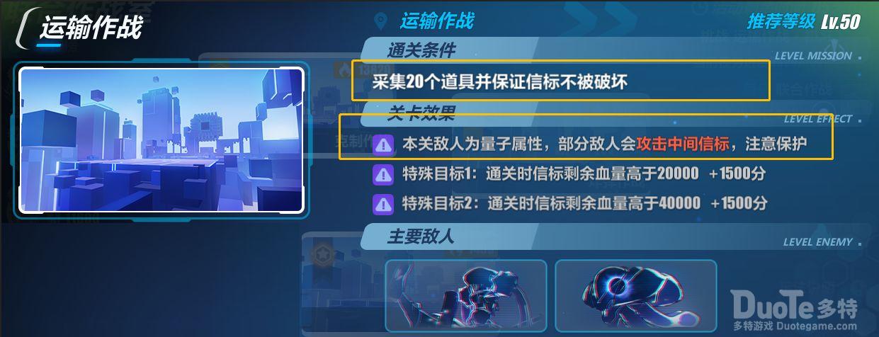 在考验双人默契配合的「运输作战」关卡中,部分量子敌人会攻击地图中间的信标,需要队友之间通力合作,完成采集20个道具并保证信标不被破坏即可顺利通关!