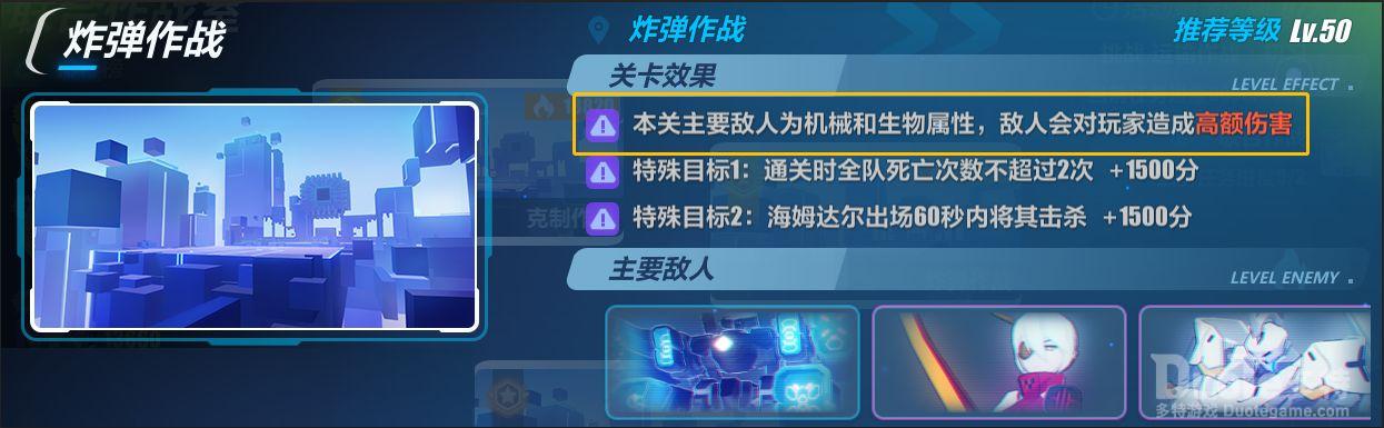 「炸弹作战」主题关卡中,敌人主要为机械和生物属性,请小心敌方炸弹的高额伤害~