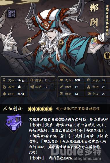 冥皇郸阴是一个改变游戏体验的英灵,越级挑战最好的帮手,毕竟六个人比五个人更能发挥出各种战术,虽然他自身输出能力不强,但是其强大的辅助能力是其他人无法替代的。其天赋能够为身边所有友军提供增伤,还能召唤出一个具有护卫的灵俑,可以某种程度代替T的功能。并且能够用来引怪、开团、单吃boss技能等多种能力。