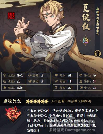 火系最强咒师,拥有强大的火系范围伤害、群体驱散、高额的单体伤害以及极强的保命能力。拥有幽城主角战阵。夏侯仪就是最好用的火系输出,可近可远。在面对最难的雷创不仅输出惊人还能提供增伤、降防。冰璃、夏侯仪、慕容璇玑组成的主角队几乎能够应对所有副本。