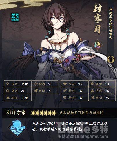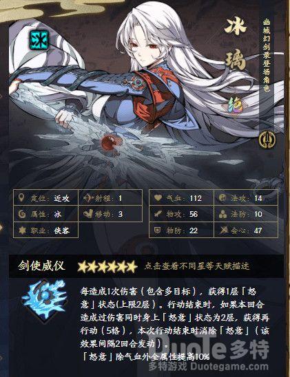 冰系最强剑客、天地劫看板娘,自身拥有高频二动天赋以及强大的物理输出,拥有开荒第一神技避实就虚。同时能够客串坦克以及自身免死。能够单刷火系副本,站桩最强剑客。比起封寒月略微逊色于机动性。