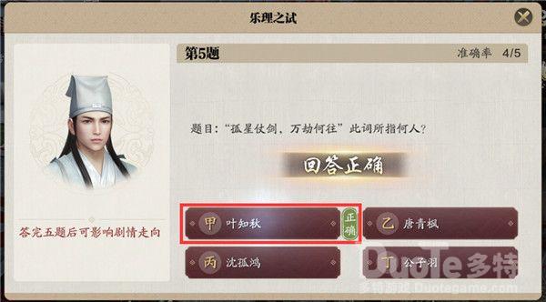 寻找完了三个任务NPC之后,回到风小雪位置,还需要跟风小雪一同参加一次模拟考试,该次模拟考试共有5个问题,问题及答案如下: