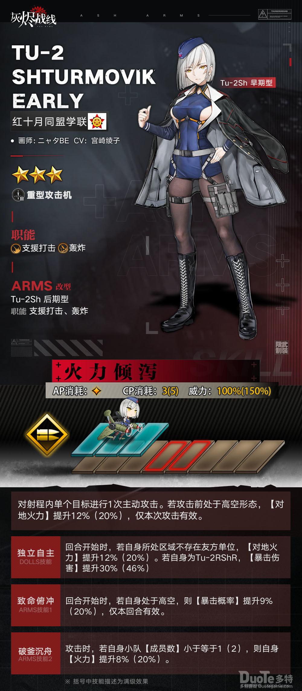 灰烬战线是一款休闲类型的养成手游,在游戏里面不同的战机是有着自己的一套培养体系的,不同种类的战斗机的培养方法是不一样的,最近官方为玩家推出了一个新角色,下面就让我们来看看灰烬战线新飞机Tu-2Sh早期型介绍。
