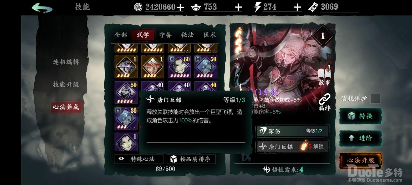锤锤锤!:1绝技增加角色基础面板的防御;2绝技概率眩晕,紫色心法容易养成,前期到后期都较为实用,可与夺命勾构成t3羁绊忠实守卫。