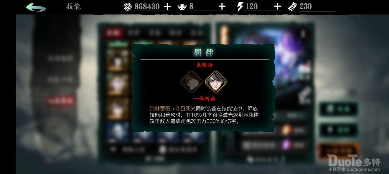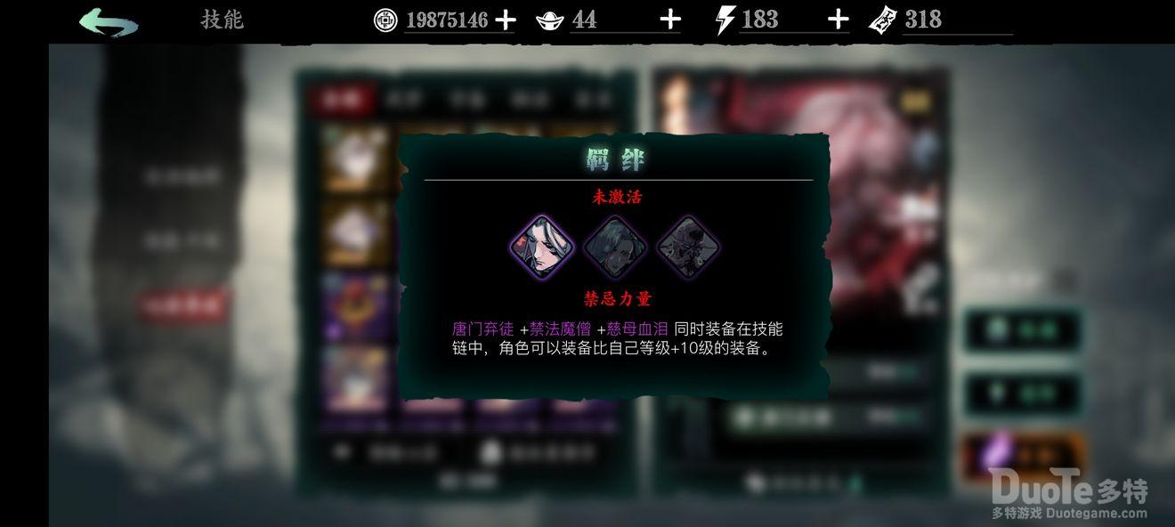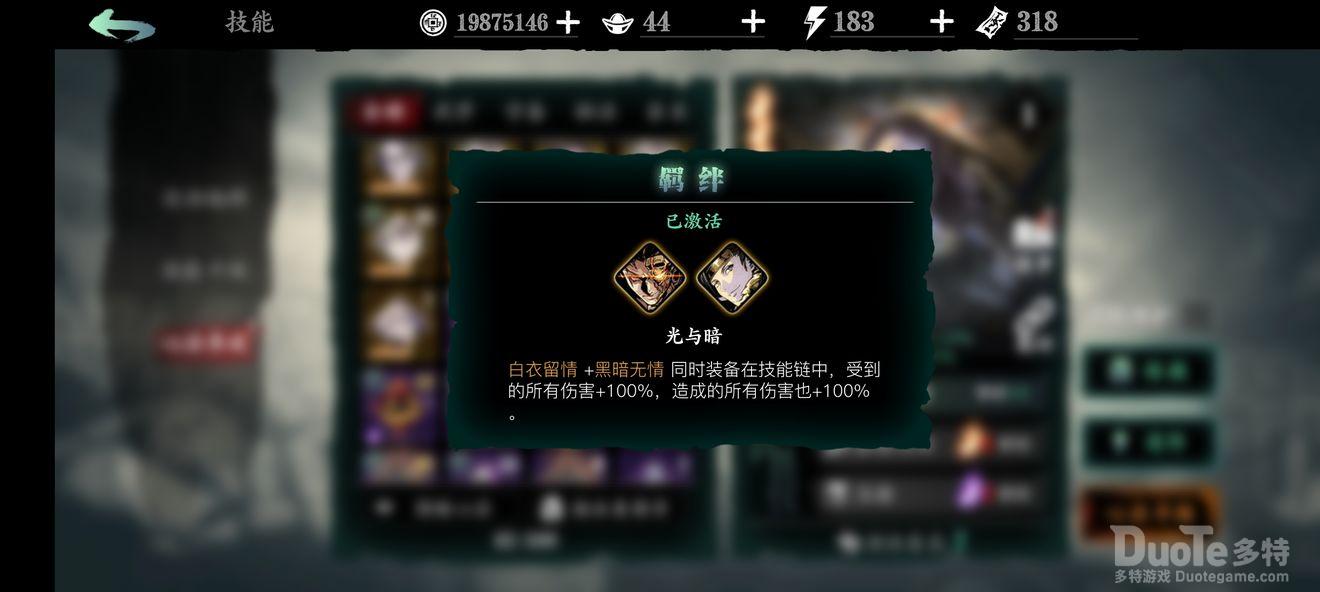 光与暗(俗称黑白羁绊):由黑暗无情与白衣留情组成,升华后全伤+150%,前期在装备上所投入资源不多时必带他,因所堆词条不多,初始带他伤害非常可观,免去刮痧烦恼,对萌新来说可以算是t0级别的;后期随着所走流派与所堆词条的不同,再加上悟性的限制,黑白羁绊也就显得可有可无了。