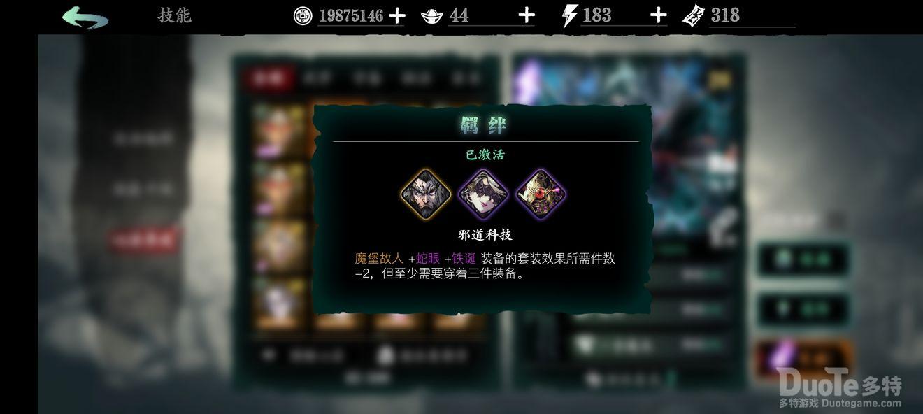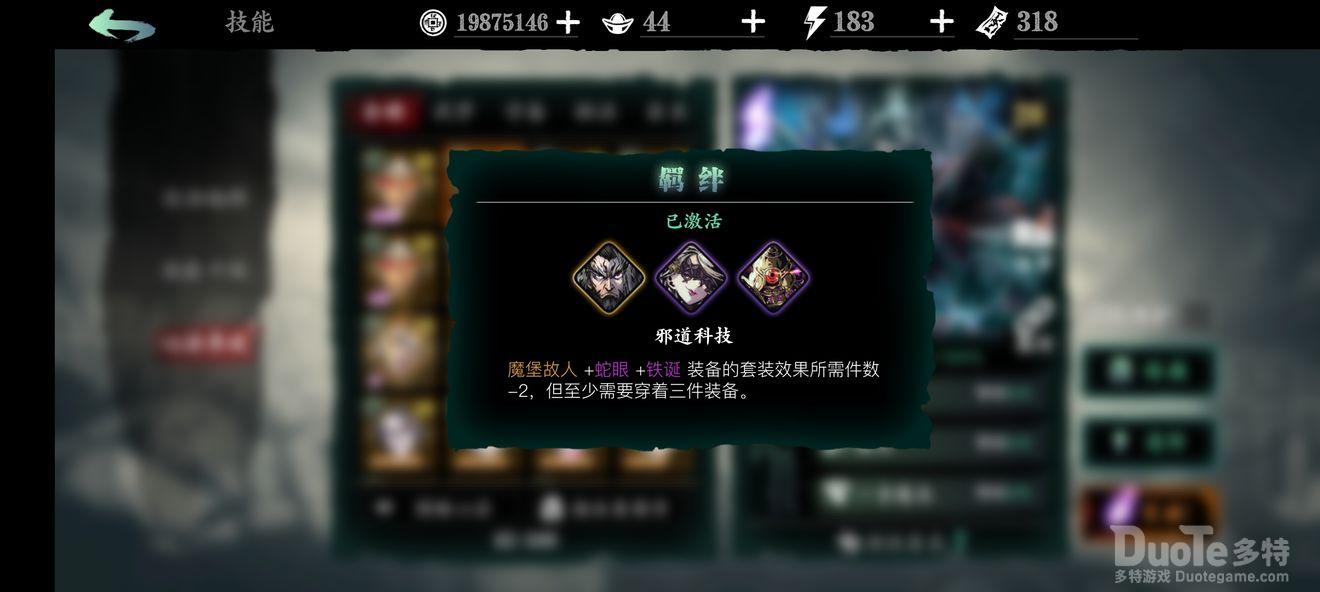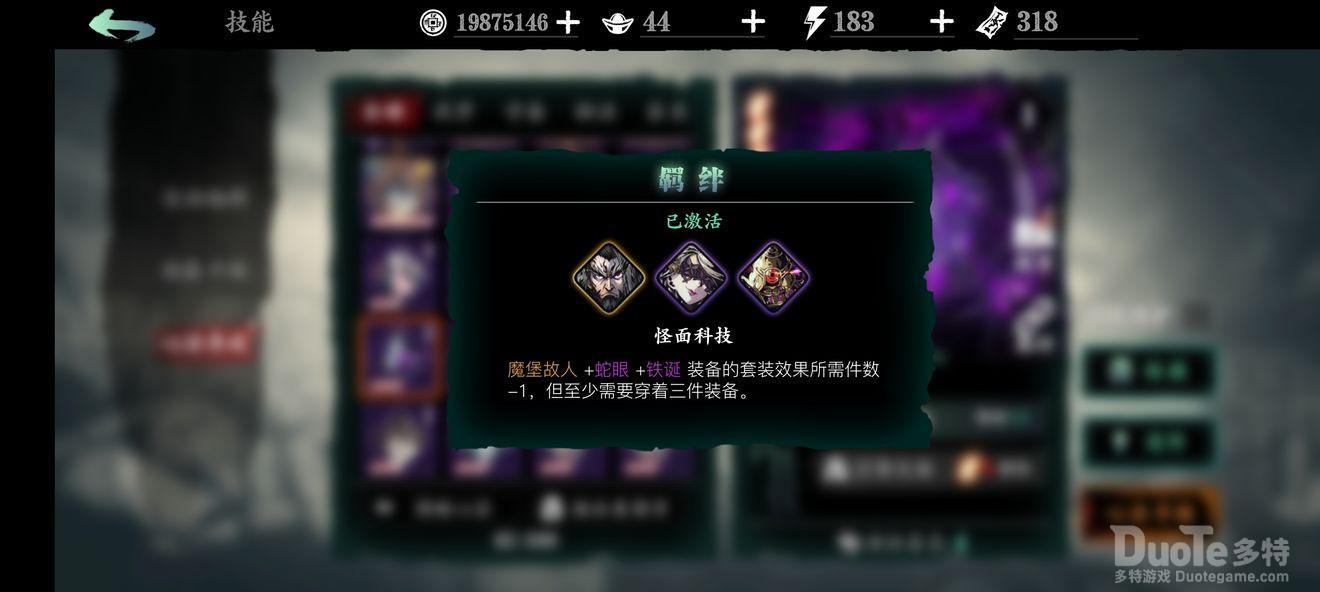 怪面科技(俗称魔堡羁绊):由魔堡故人+蛇眼+铁诞组成,其羁绊效果前期无用,后期必备,毕业必选,升华为邪道科技所需件数-2后与五圣祝福(衣)刻印搭配可以实现穿两件套装(除衣),有四件套装的效果;因魔堡故人心法强力的缘故,前期就可以开始培养。
