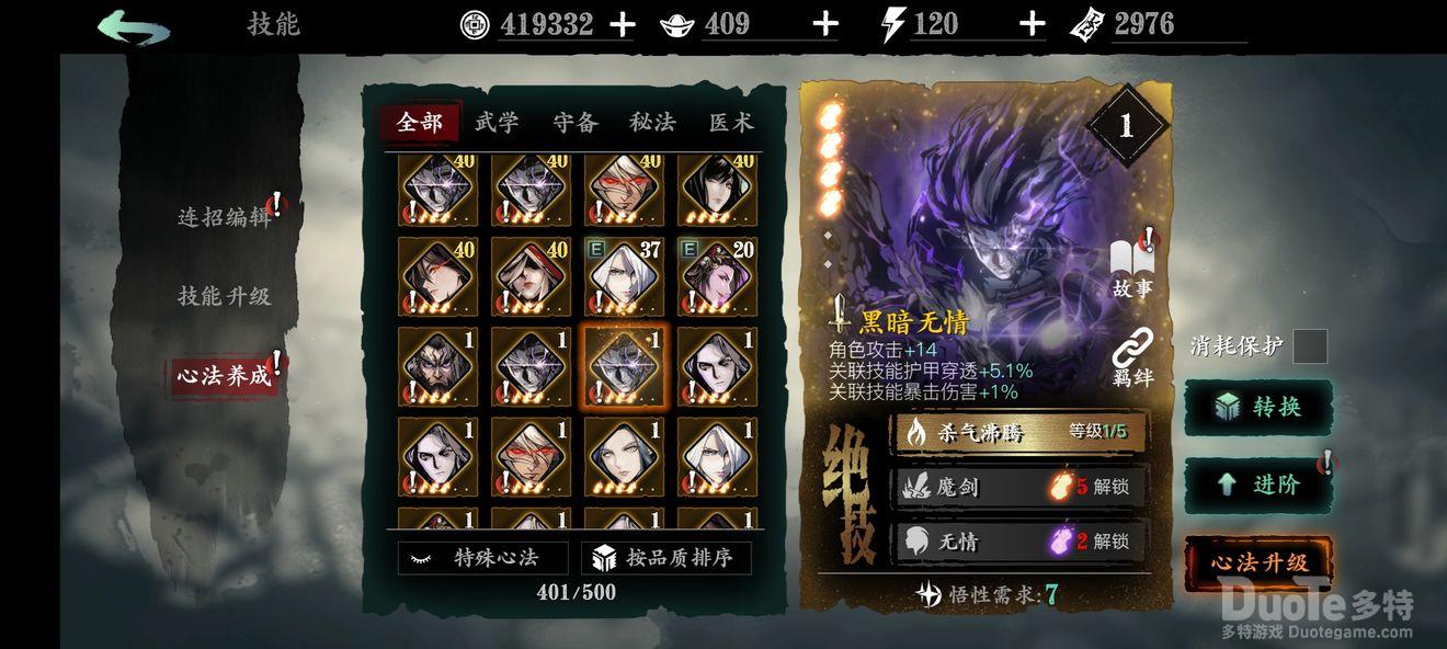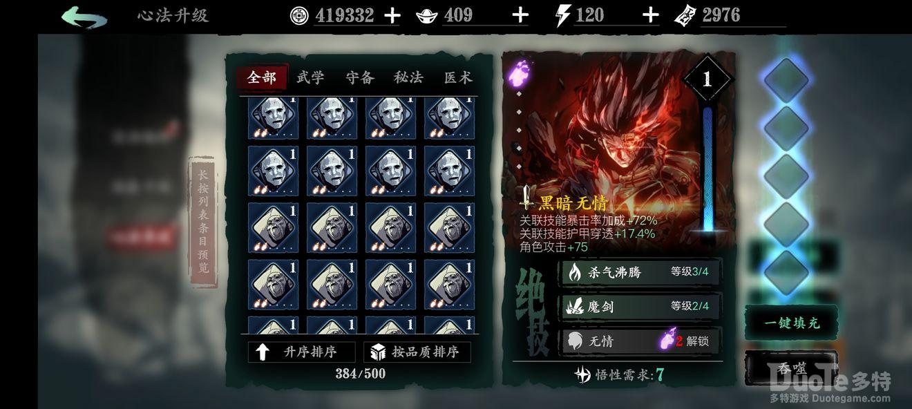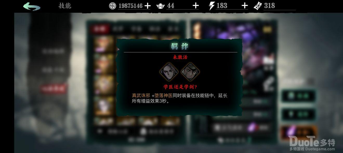 学医还是学剑?(俗称医剑羁绊):用来给buff类心法延时,心法不足时的替补位,金色心法基础面板较高,副心法/狗粮替补位,堕落神医的2绝技所召小怪在前期也很能打。
