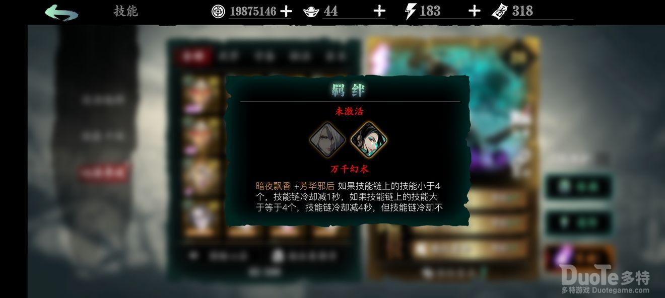 万千幻术(俗称暗芳羁绊):升华后技能链小于4个时冷却减2秒,大于等于4个时,冷却减6秒,后期伤害不能秒图时必备,用来缩减技能空档期,增加容错率;前期杀意不足时可携带暗夜飘香来获取杀意,后期走杀意流时也可携带。
