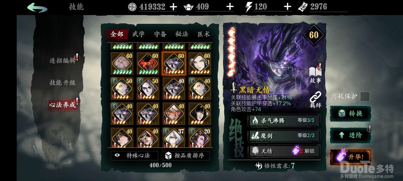 珍藏心法-心法分两种,普通心法和珍藏心法,珍藏心法的优势是基础面板比普通的略高一点,绝技上限也更高一点,所以养普通还是养珍藏玩起来都没多大差距,而且后面心法升华还要把同样的心法当狗粮吃,所以抽出合适的直接养就行。放两张对比图
