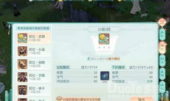 强化装备可以直接的提升角色的战斗力,装备强化每四段升一级,每五级会大幅增加一次材料的消耗,每10级解锁一次武器特效。