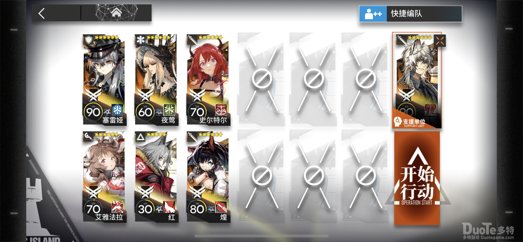 阵容摆放如图所示,顺序为塞雷亚,煌,夜莺,艾雅法拉,银灰,怪多记得开技能就过了