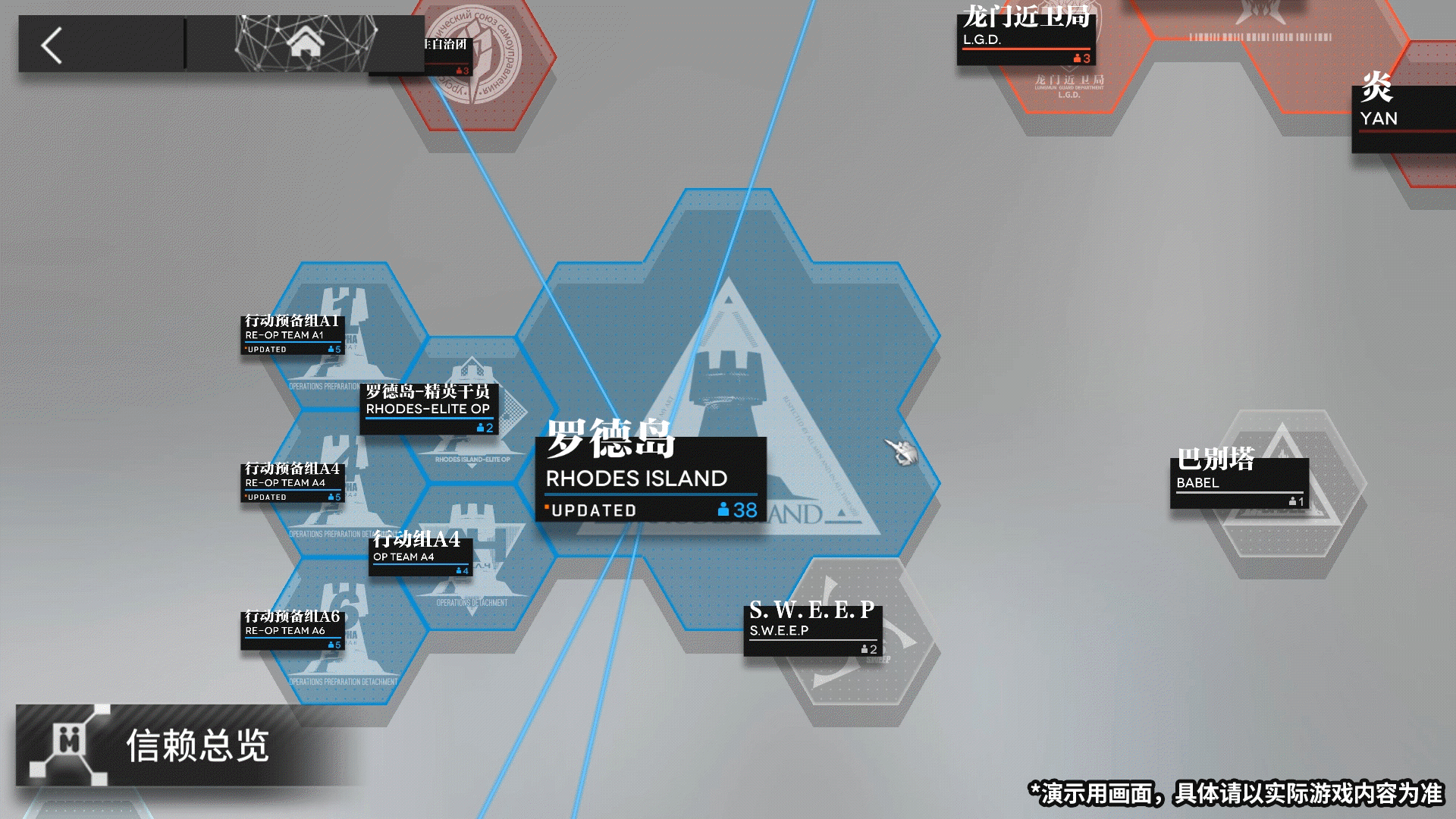 新的关系网通过角色所属势力进行区分,点击势力可看到该势力及其相关势力的干员。可点击已获得干员,查看相应干员的详细信息。