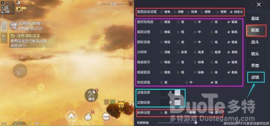 画质、帧率和滤镜设置:为了达到更好的游戏效果,游戏中提供了画质、帧率和滤镜的相关设置: