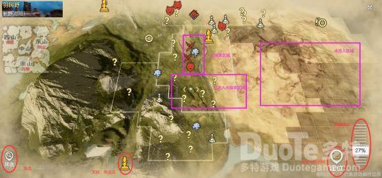 地图探索:点击游戏界面最左上角打开地图,右下角缩放选项拖动即可调整地图比例,定位选项可以设定导航目的地。地图中当前尚未进入的区域不显示细节,已进入未探索的区域地图上会显示问号,问号经探索后会出现对性的图标,具体图标介绍还请移步主攻略部分查看。