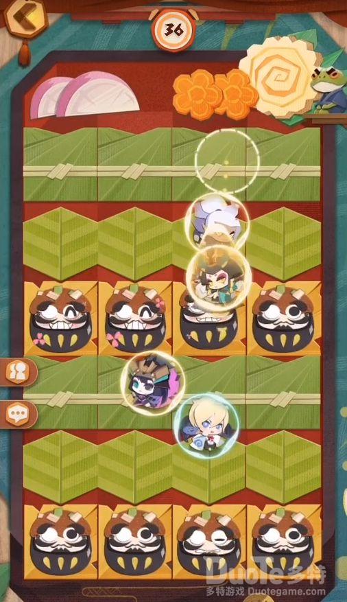 在第二关中会出现两排小丸子达摩,每碰撞一次小丸子达摩就会改变一次颜色,家主需要通过碰撞将每一串上的小丸子达摩变成同一颜色,即可通关。