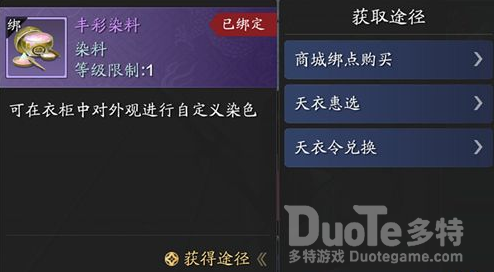 首先大家要知道我们染色是需要用到染料的,可以用绑点直接购买,当然你也可以同天衣惠选、天衣令兑换来获得,消耗很少每个玩家们都能获得,不用担心染料价格很贵。一般来说局部染色分为时装发型、上衣、下装三类。